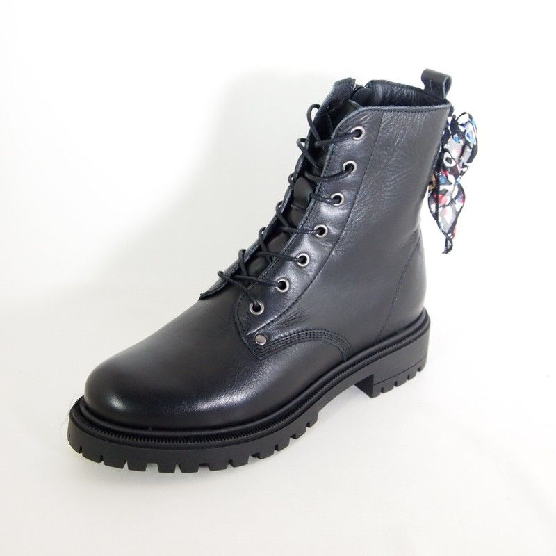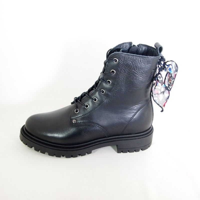 Botines Good Step 4532-C03 con cierre de cordonera central ajustable y cremallera lateral, fabricadas en corte de suaves pieles en color negro con detalle de pañuelo en forma de lazo extraíble trasero y suelas de goma con tacones de 4cm. de altura.