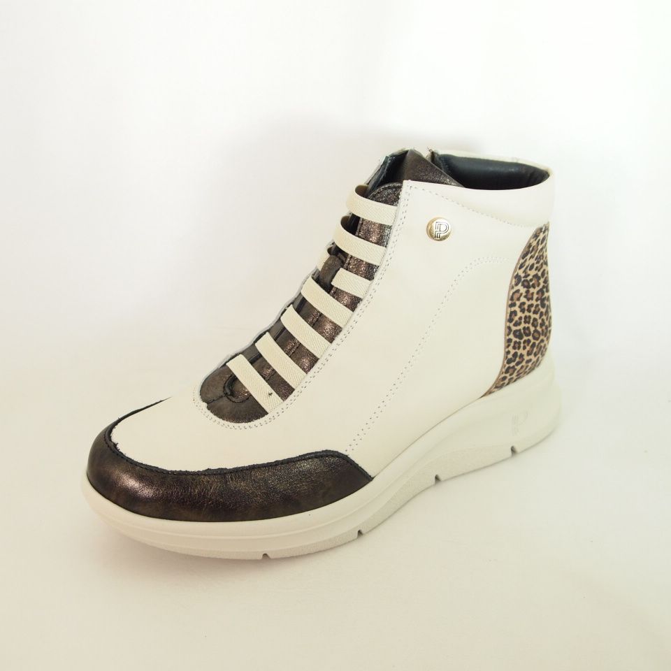 Botines Pitillos 10754, fabricado en piel combinado con telonera animal print , ajuste de cremallera, adorno elásticos beiges, cuña de 5 cm.