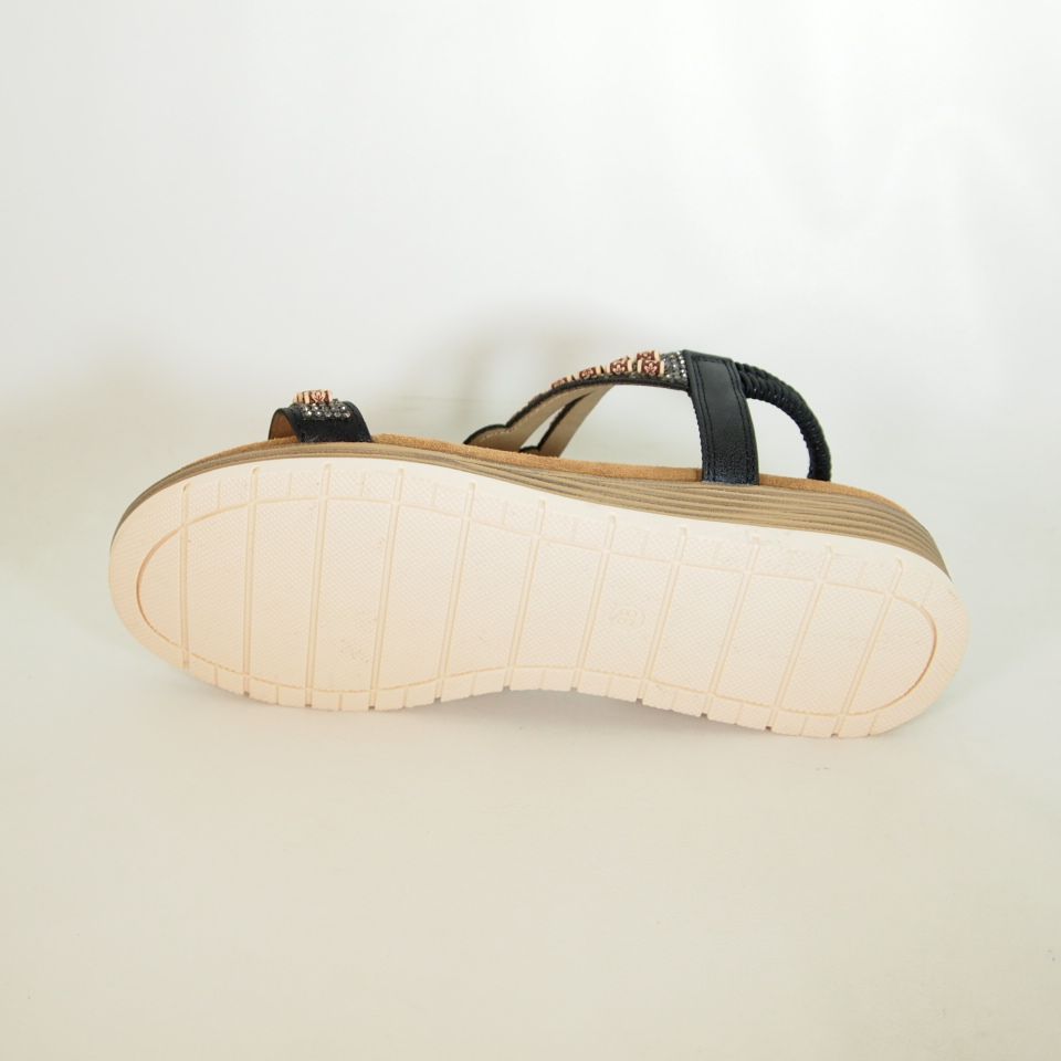 Sandalias Amarpies ABZ28680 de corte sintético, en color negro con pequeños brillantes en la pala y pespuntes al tono. Práctico ajuste gracias a un elástico que nos facilitará su calce. Forro de polipiel y planta suave acolchada confort, para proporcionar mayor comodidad en la pisada, (todo ello al tono)