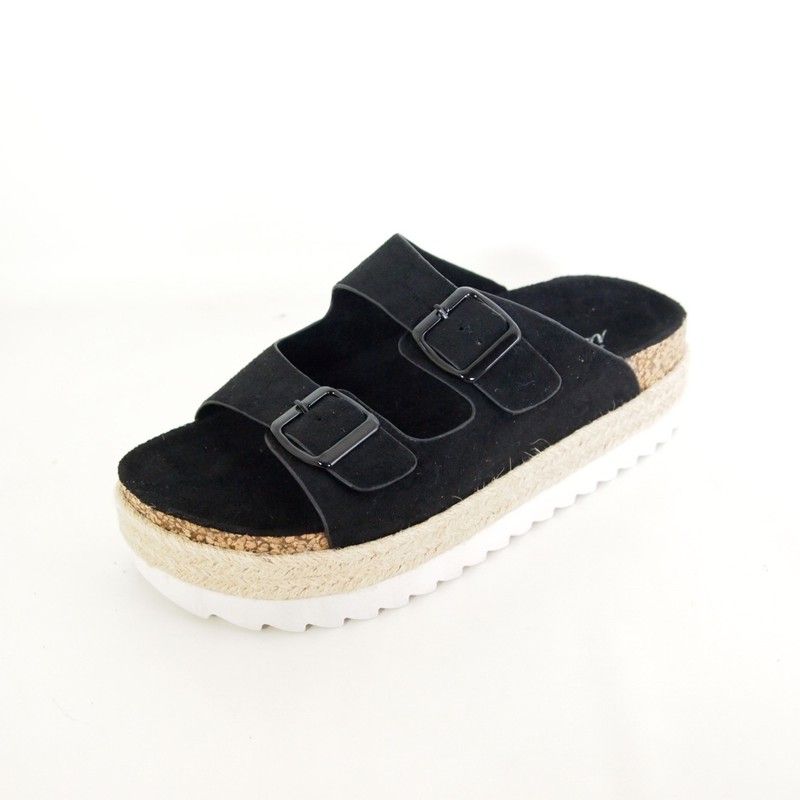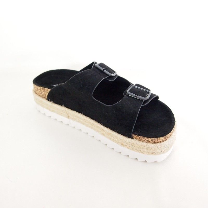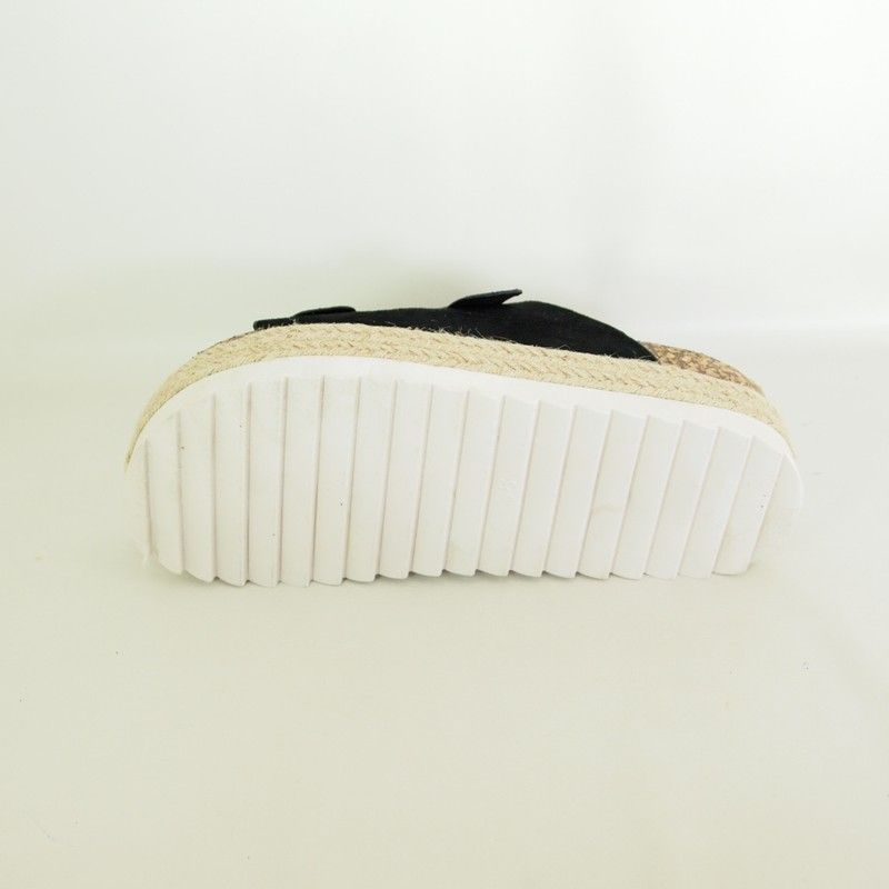 Sandalias Isteria 22053 con piso bio de 3,5 cm. y cinta de esparto trenzada decorativa. Plantilla suave. Tiras en la parte delantera de antelina color negro con hebillas decorativas. Acabado redondo. Suela de goma antideslizante.
