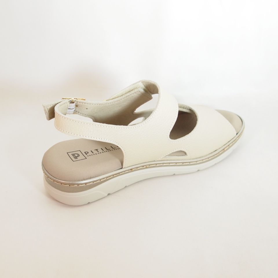 Sandalias Pitillos 11000 fabricadas en piel color crema con ajuste de hebilla y velcro, altura de piso 3 cm. Zapato de estilo casual, suela de goma termoplástica, exterior piel e interior forro textil.