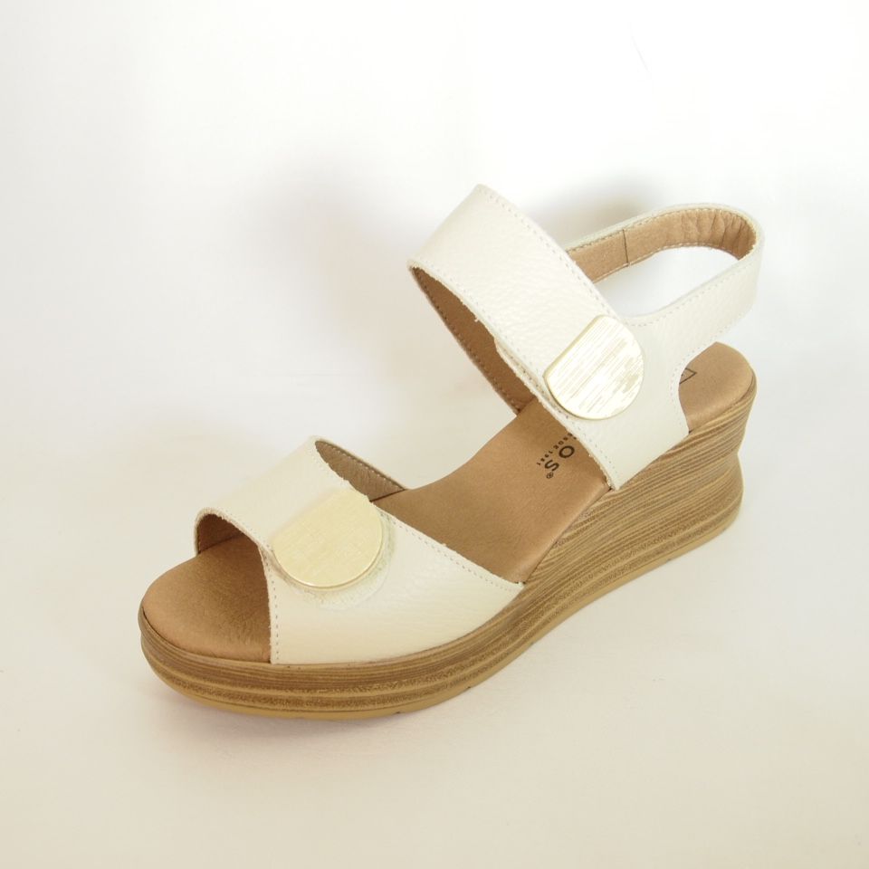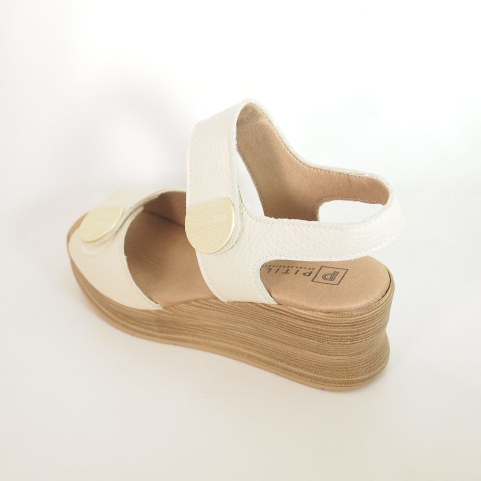 Sandalias Pitillos 11054 fabricadas en piel color cuero con platilla acolchada y ajuste de velcros. Cuña de 6 cm. do los cuales 3,5 cm. pertenecen a la plataforma.