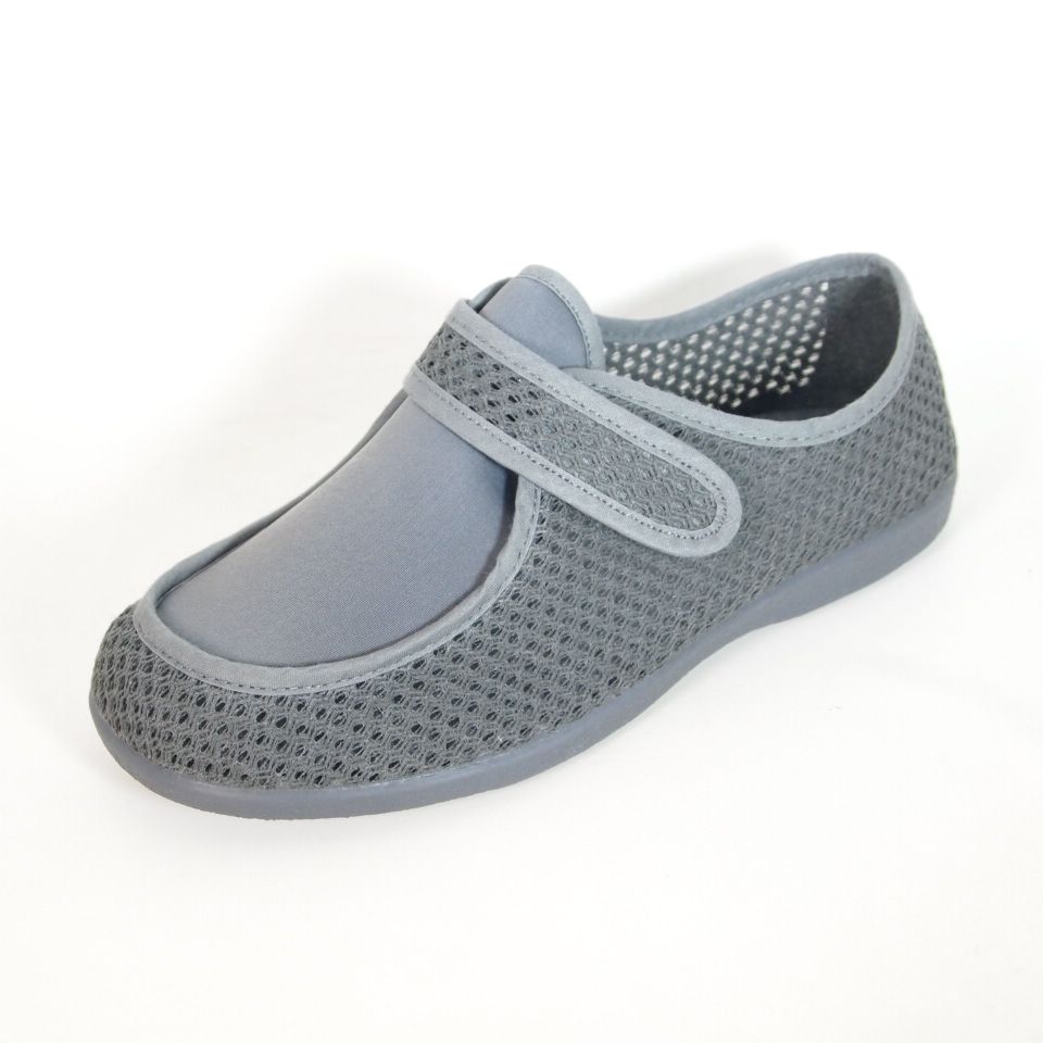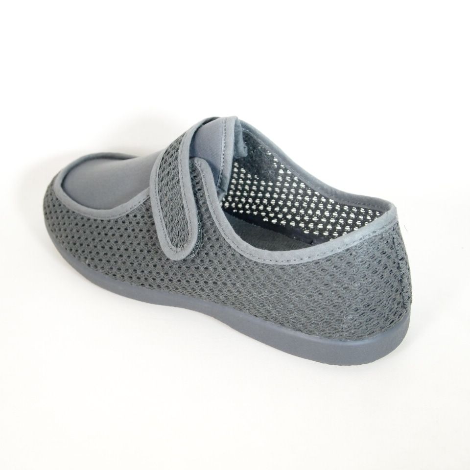 Zapatillas de casa Garzón 6870-105 de color gris oscuro con cierre de tira de velcro ajustable, fabricadas en tejidos suaves. Suelas de goma con 4 cm. de grosor de cuña.