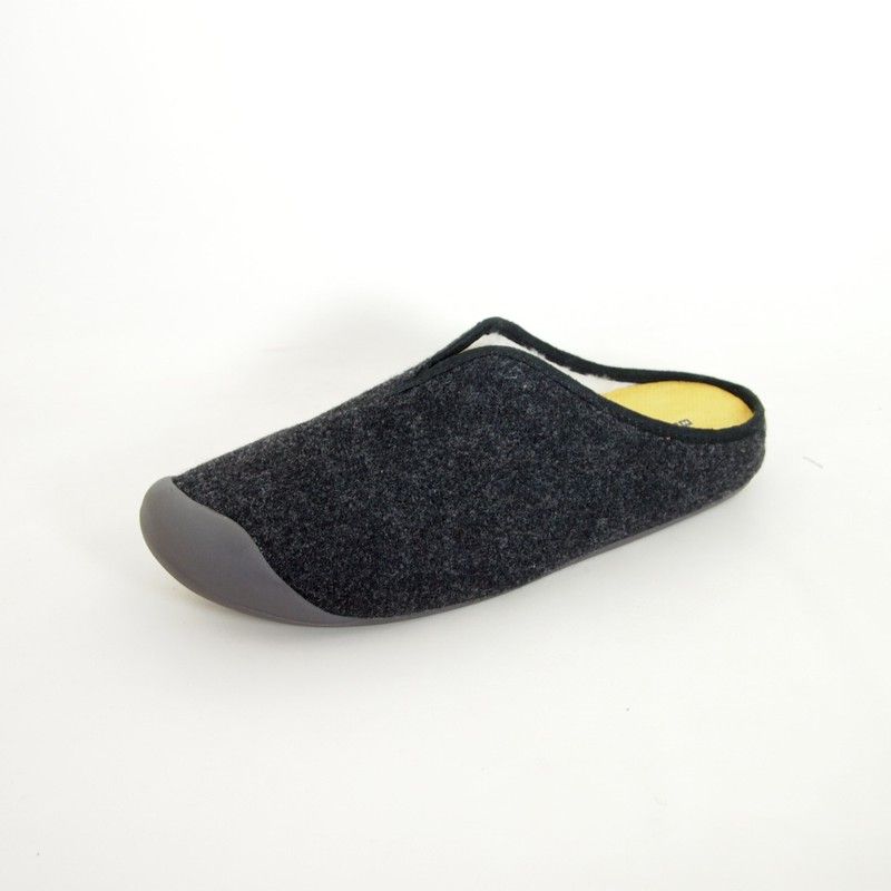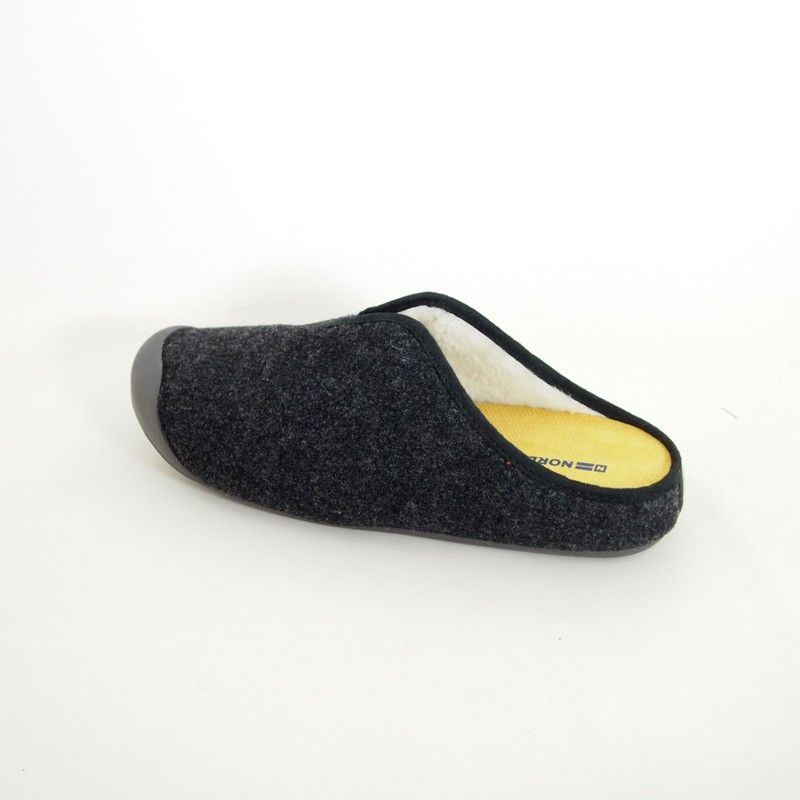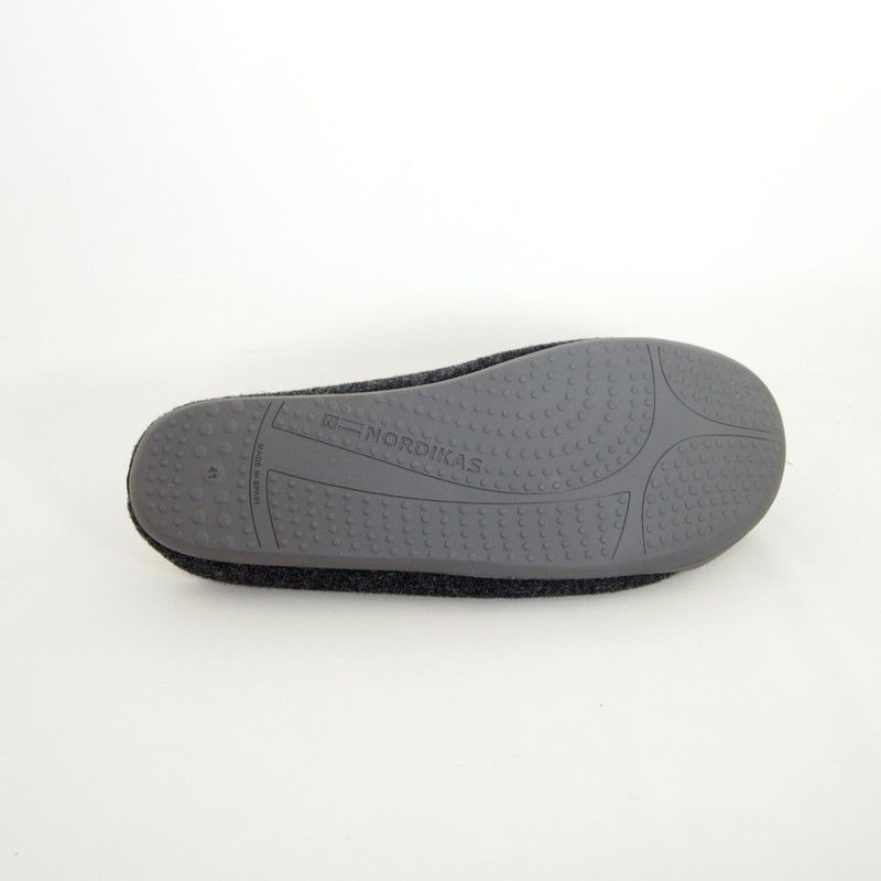Zapatillas de estar por casa Nordikas 9925, 100% lana de tejido fieltro color negro, abierta en la talonera. Con un diseño moderno y original, cómoda y ligera . Muy cálida y confortable. La suela es de goma antideslizante y aislante del frío , la puntera esta reforzada para evitar golpes. FIELTRO: Tela hecha de borra, lana o pelo prensados y sin tejer que se usa en la confección deprendas de vestir, sin trama ni urdimbre. Proporciona 100% el descanso en sus pies.