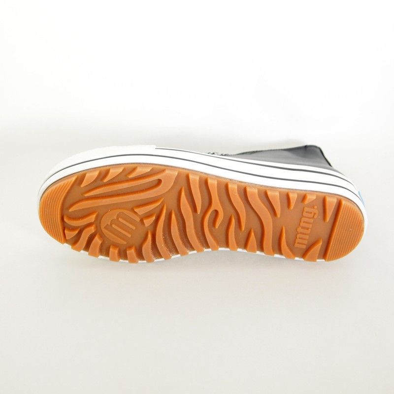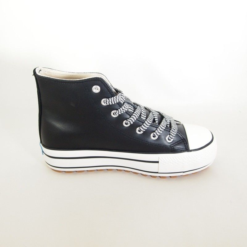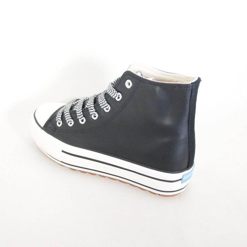 Zapatillas deportivas Mustang 60298 de color negro abotinada para chica diseñada en piel sintética con suela gruesa y puntera de goma con detalle del perfilado en negro y cierre de cordones en estampado animal print combinada con tira del mismo estampado en la talonera. Plataforma de 4 cm.
