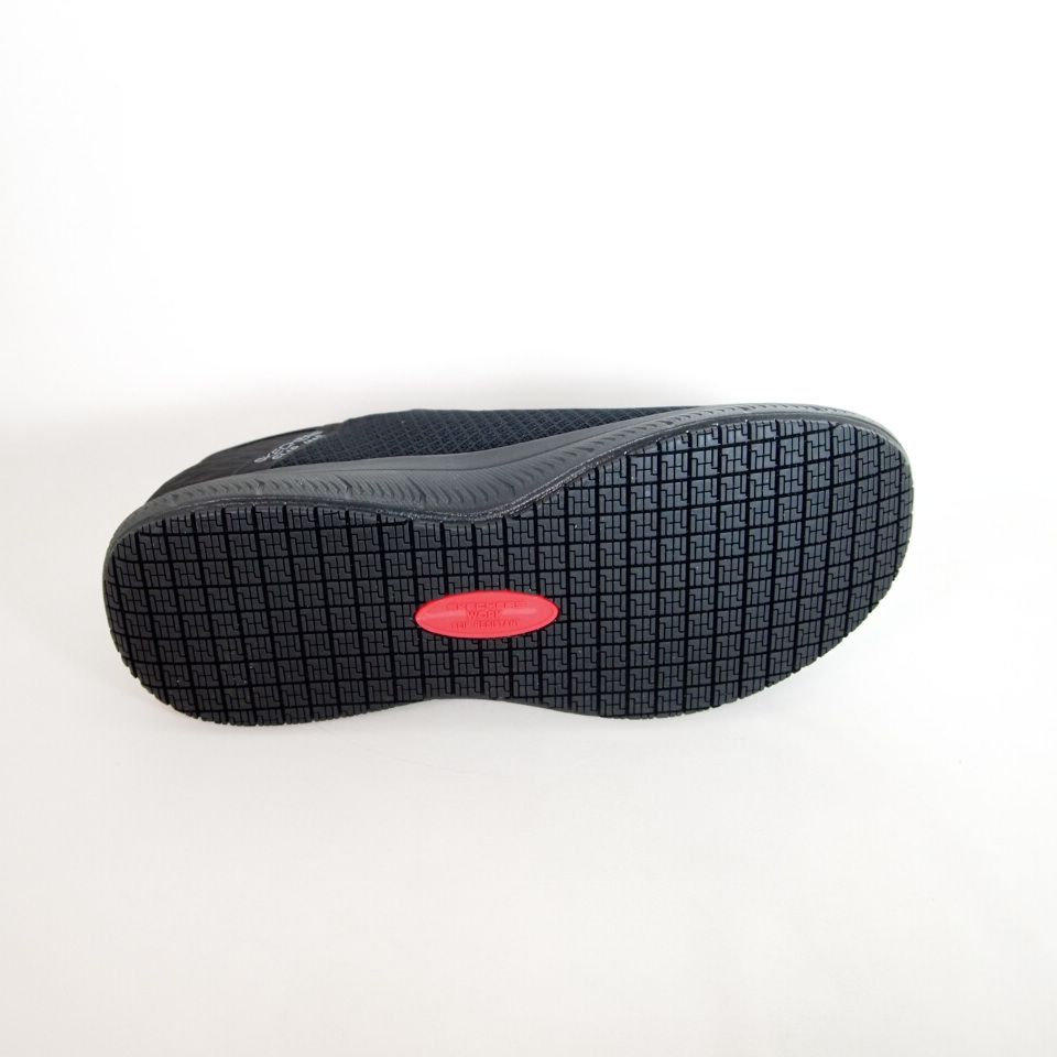Diseño TOUCHLESS FIT para el trabajo presenta una parte superior sintética de knit con nuestra exclusiva Heel Pillow para el talón, una suela antideslizante y una cómoda plantilla con amortiguación Skechers Air-Cooled Memory Foam®.