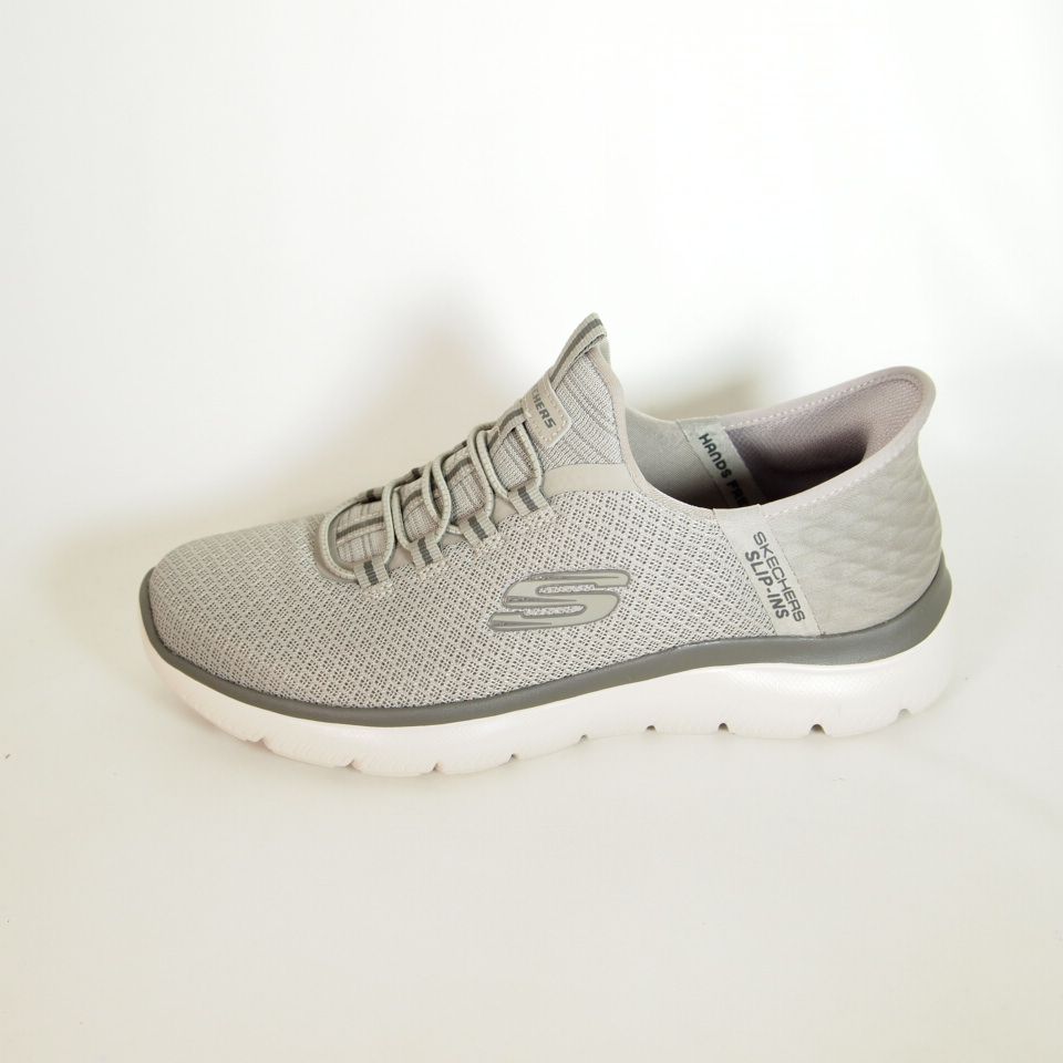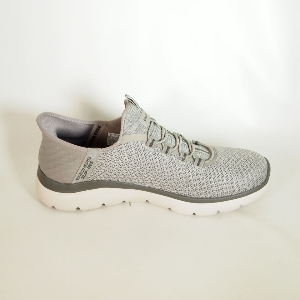 Zapatillas deportivas Skechers 232457 Summits High Range de color taupe que cuenta con un panel moldeado único en el talón Skechers Slip-ins, una parte superior de malla con cordones fijos y una plantilla con amortiguación Skechers Air-Cooled Memory Foam.