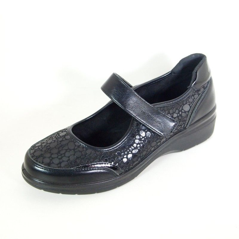 Zapatos Amarpies AMD 27070 de color negro muy confortable con ajustable con velcro, original detalle en forma de grabado. Suela de 4,5 cm.
