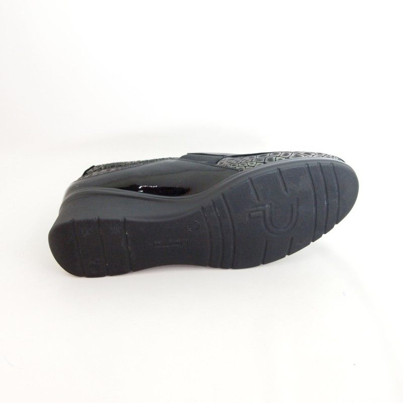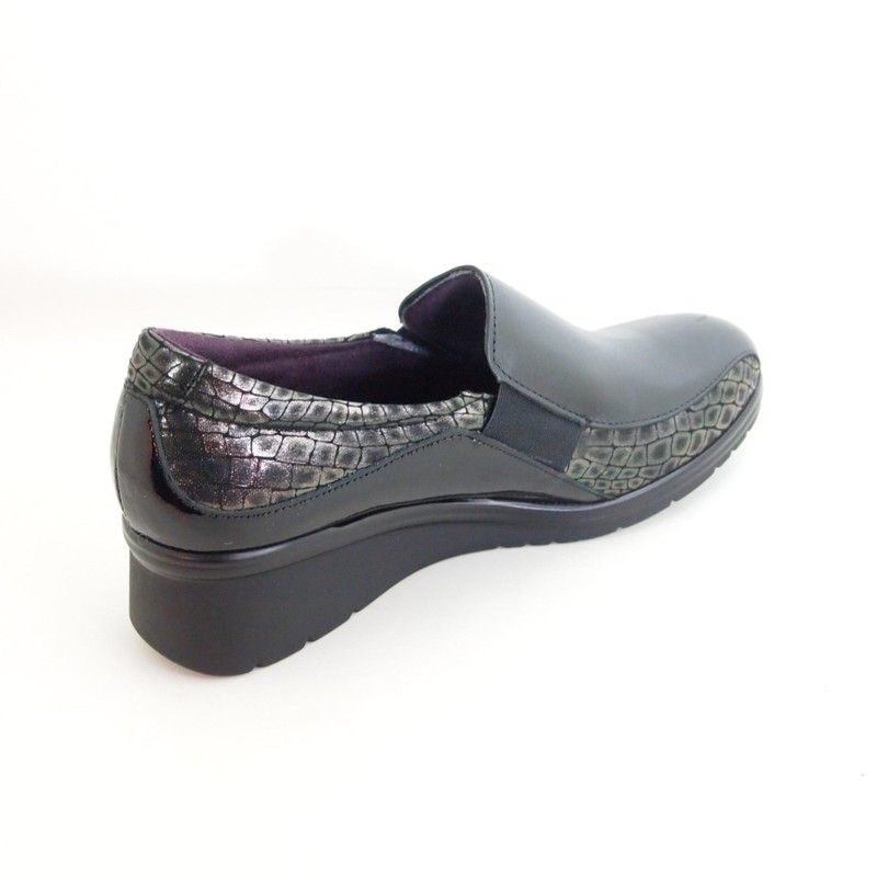 Zapato de mujer fabricado en España por la marca Pitillos. Pieles con distintos acabados en color negro con elésticos laterales para un perfecto ajuste. Piso antideslizante con una cuña comoda y flexible de 4,5 cm.