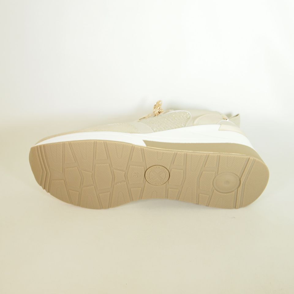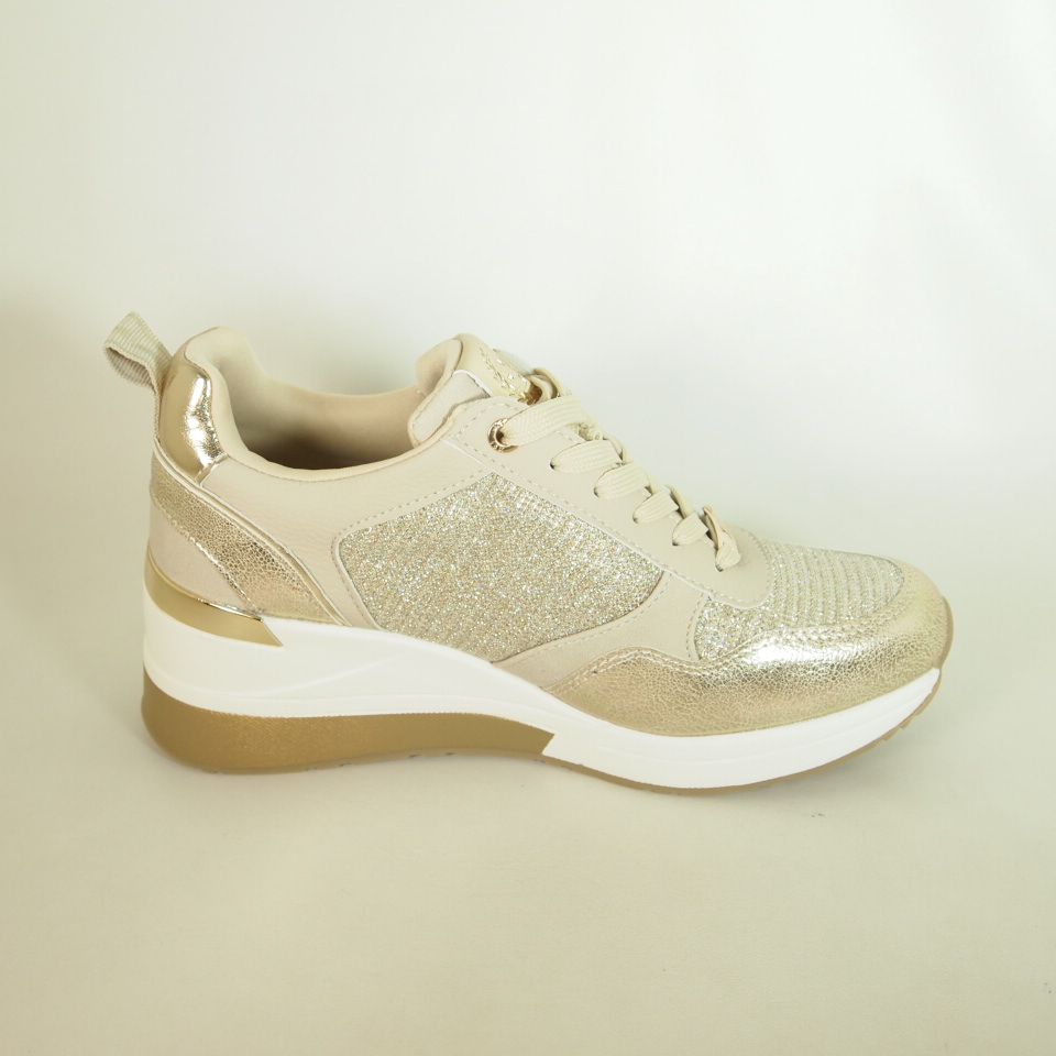 Zapatos Xti 143717 de color oro fabricado en material que imita la piel. Con cierre cremallera lateral y cordones ajustables para mayor comodidad. Suela de 7 cm.
